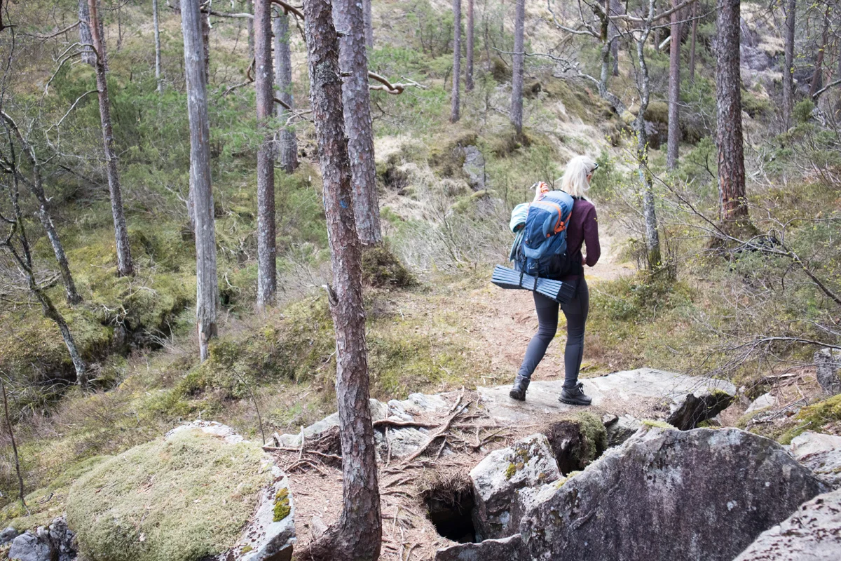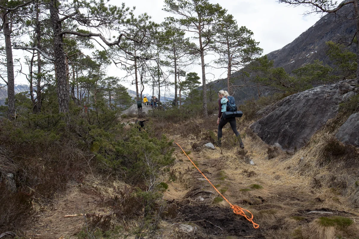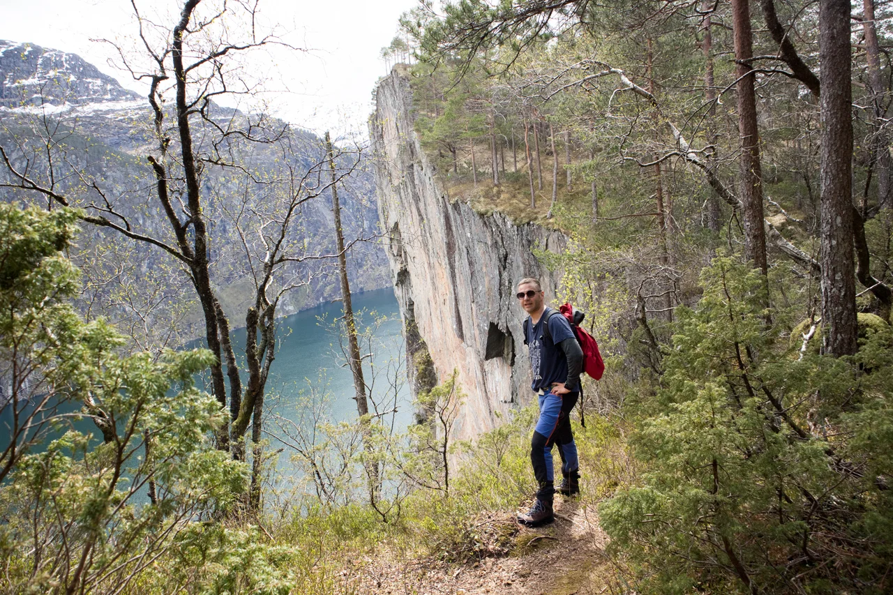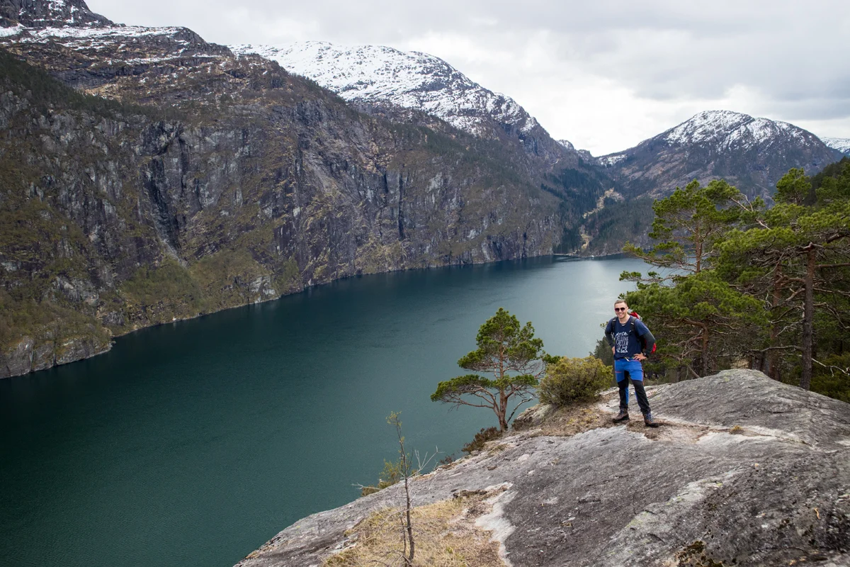 På toppen er det postkasse, liten minvarde og en imponerende utsikt over Romarheimsfjorden i begge retninger. Har du høydeskrekk bør du ikke gå for langt utpå kanten. Returner samme vei.