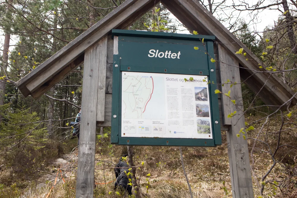 Detter er en lett tur som passer for alle. Fra veien er det ca. 1,3 km til Slottet som er en fjellhylle som breier seg ut i Romarheimsfjorden 192. moh.