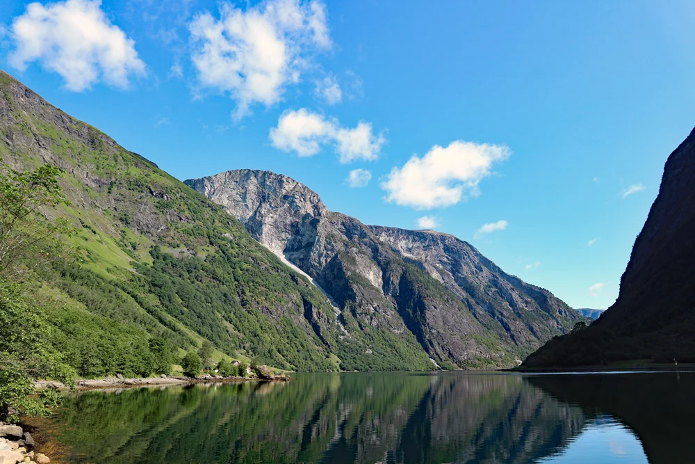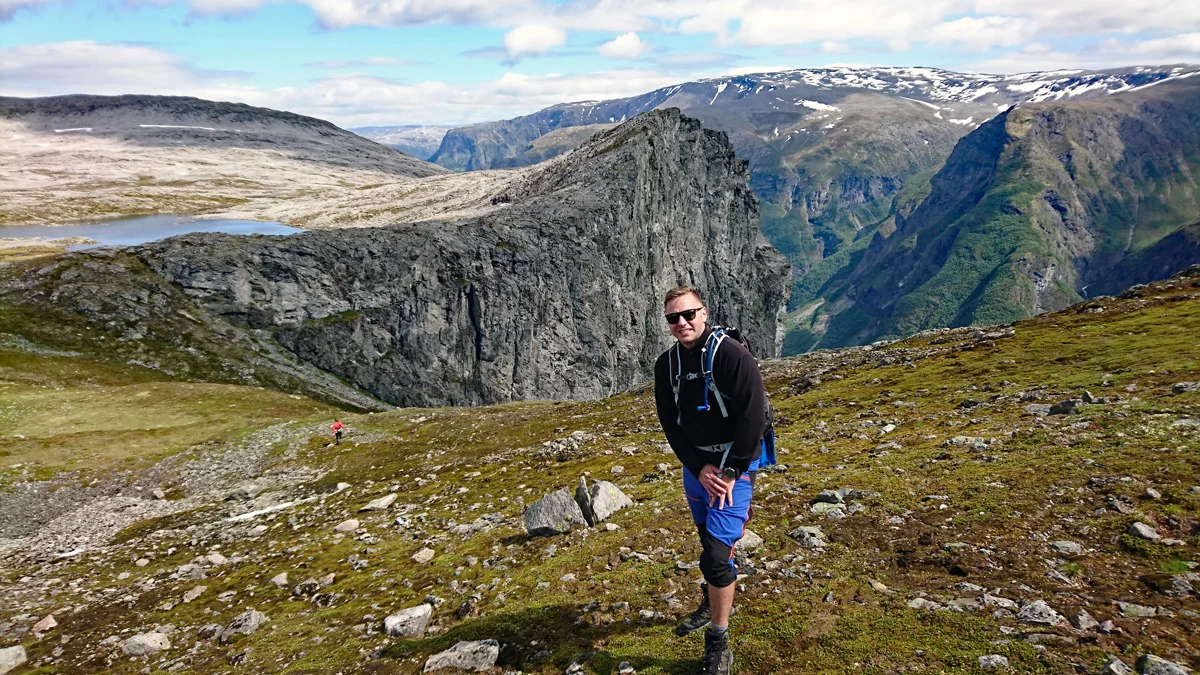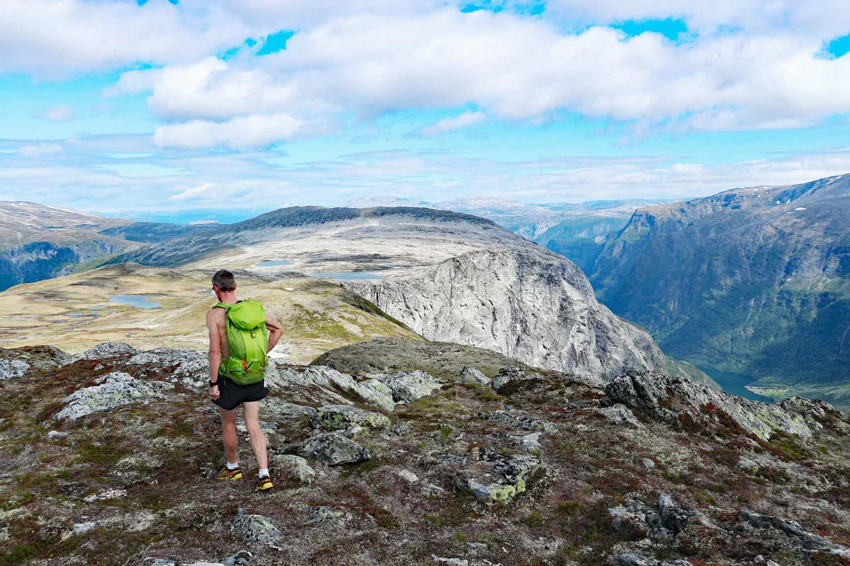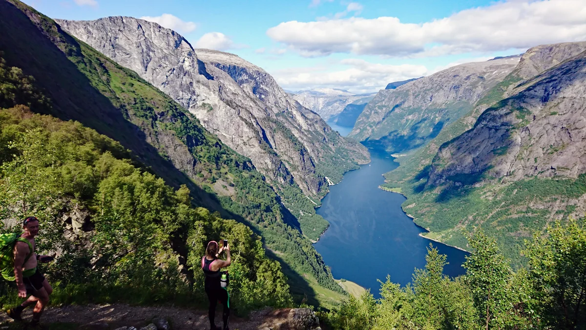 Fra Breiskrednosi går det stupbratt 1000 meter rett ned i fjorden, og du får fantastisk utsikt innover mot Nærøyfjorden og Gudvangen.