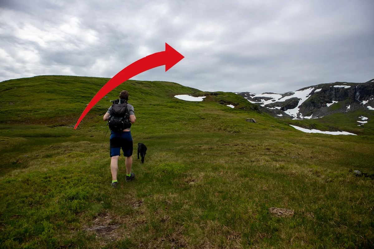 Herfra blir stien dårligere. Du skal opp på ryggen på din venstre side. Gå opp mot sør til du kommer opp på ryggen. Du kan se en mini varde som markerer et utsiktpunkt. Oppe på ryggen føler du den mot sør-vest. Terrenget er for det meste flatt, men noen steder går det ned i dumper. Det er ikke noe markert sti her så man må følge terrenget. Gå vestover opp på neste platå. Her er det bratt, men du vil se sti/dyretråkk mot høyre. Når du kommer opp kan du se Finnbunuten varden i det fjerne.