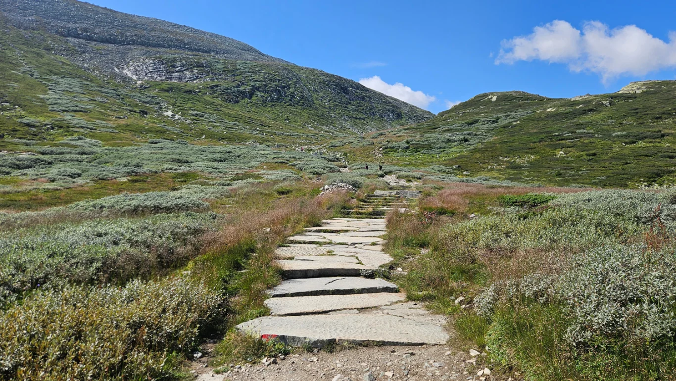 Stien starter i et åpent fjellandskap og stiger jevnt oppover i steinete terreng. Underveis er det fantastisk utsikt over fjellene rundt Rjukan. De siste kilometerne opp mot toppen går gjennom ur, men stien er godt merket. På toppen finner du Gaustatoppen turisthytte, hvor du kan kjøpe mat og drikke.